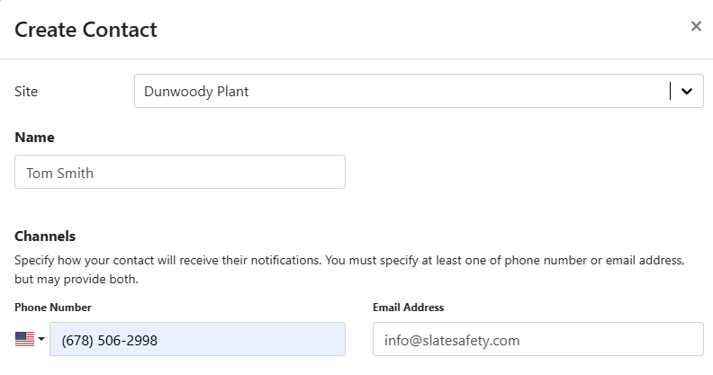 - Identify what site the new Alert Contact will be a part of as well as a name and channel to receive the alerts.