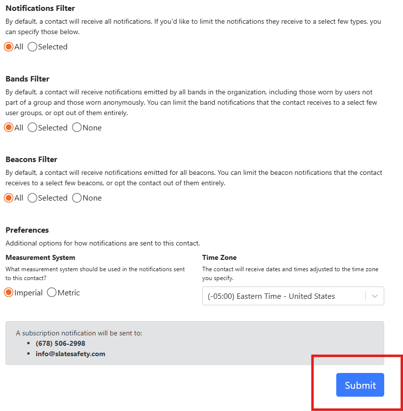 - Next, complete the specific filters for this new Alert Contact. There are options to only receive certain types of notifications. Additionally, there are options to only receive notifications for certain Bands or Beacons.