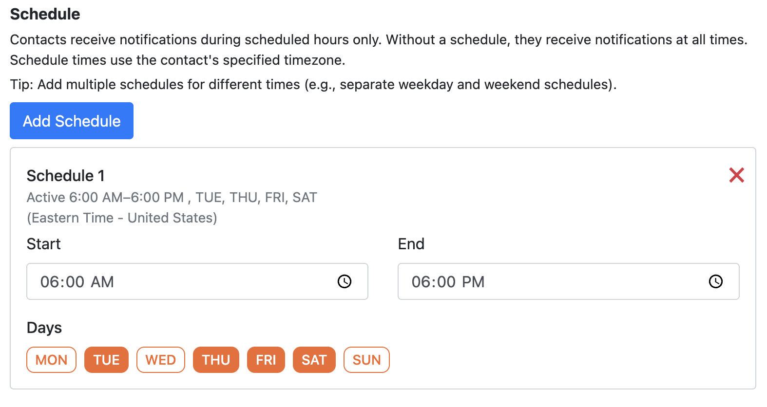- Next, you can add one or more Schedules. Schedules allow for Alert Contacts to only receive Notifications during specific days and hours of the week.